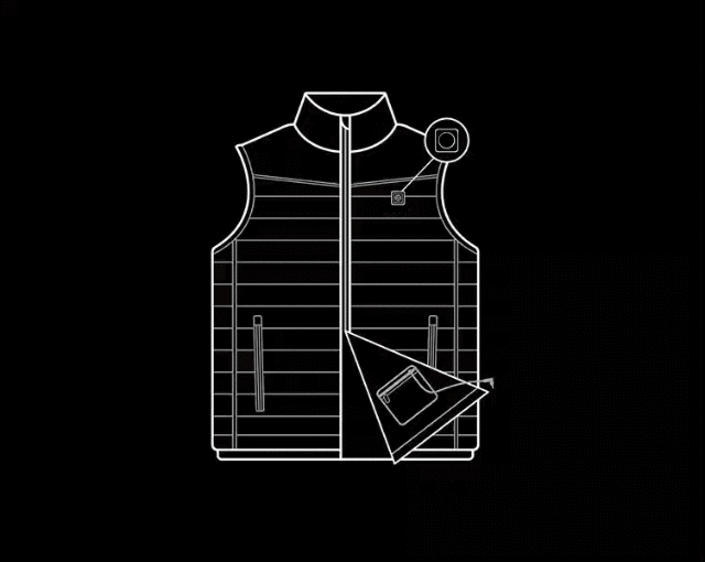 Wear your heated vest with or without the heating elements engaged to keep your core warm, simply press the control button to your desired warmth level and wait. Your battery pack will signal the conductive threading to send electrical currents throughout the item, reaching the temperature you’ve requested in roughly 30 seconds or less.